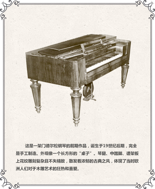 這是20世紀(jì)初誕生的門德爾松鋼琴。這個(gè)時(shí)期工業(yè)上有了較大的發(fā)展。在制造鋼琴方面也有了較先進(jìn)的機(jī)器輔助。制造的立式鋼琴外觀上給人簡(jiǎn)潔文雅,滿足了普通家庭演奏的需求,在客觀上注重外表的同時(shí),也注重了內(nèi)在的完美。
