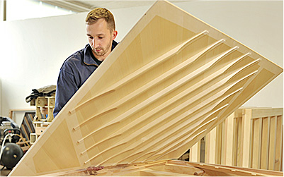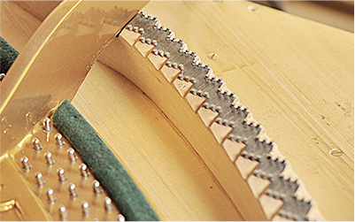 制作工藝:音板的功能相當(dāng)于擴(kuò)音器的發(fā)音膜, 存在一個(gè)弧度,這樣的弧形必須能長期保持穩(wěn)定不變形,并且承受250公斤左右的壓力。拱型的音板類似于高頻、中頻、低頻的揚(yáng)聲器,因?yàn)槊恳粔K都取自不同生長期的木塊,我們對每一塊音板都必需經(jīng)過嚴(yán)格的音質(zhì)測試, 挑選發(fā)音優(yōu)質(zhì)的音板使用。 這個(gè)測試是以沙子實(shí)驗(yàn)為基礎(chǔ),來決定音板各部位的厚度,使高低音的音色過渡均勻。為了使鋼琴共鳴系統(tǒng)更大,我們進(jìn)行了超寬的音板1450mm規(guī)格設(shè)計(jì)。
