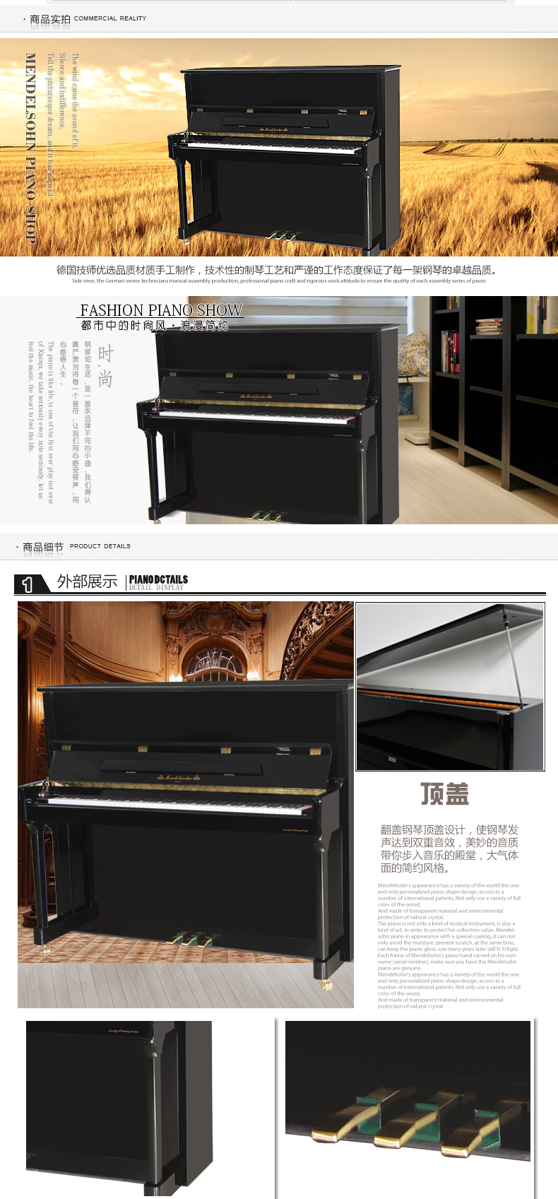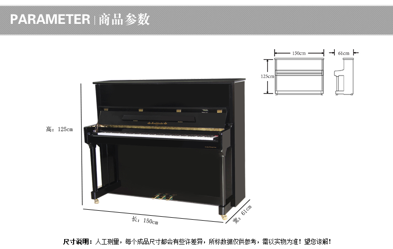 采用彰顯尊貴的歐式外型設(shè)計(jì),精選高品質(zhì)材質(zhì),雅致外觀與超凡音質(zhì)相結(jié)合。德國高級技師手工組裝制作,專業(yè)的制琴工藝和嚴(yán)謹(jǐn)?shù)墓?作態(tài)度保證了每一架進(jìn)口系列鋼琴的卓越品質(zhì)。同時,每一架進(jìn)口系列鋼琴在出廠時都須經(jīng)過嚴(yán)格的檢驗(yàn)、調(diào)試、整理,保證每位使用者都 能感受到它的純真的音質(zhì)。