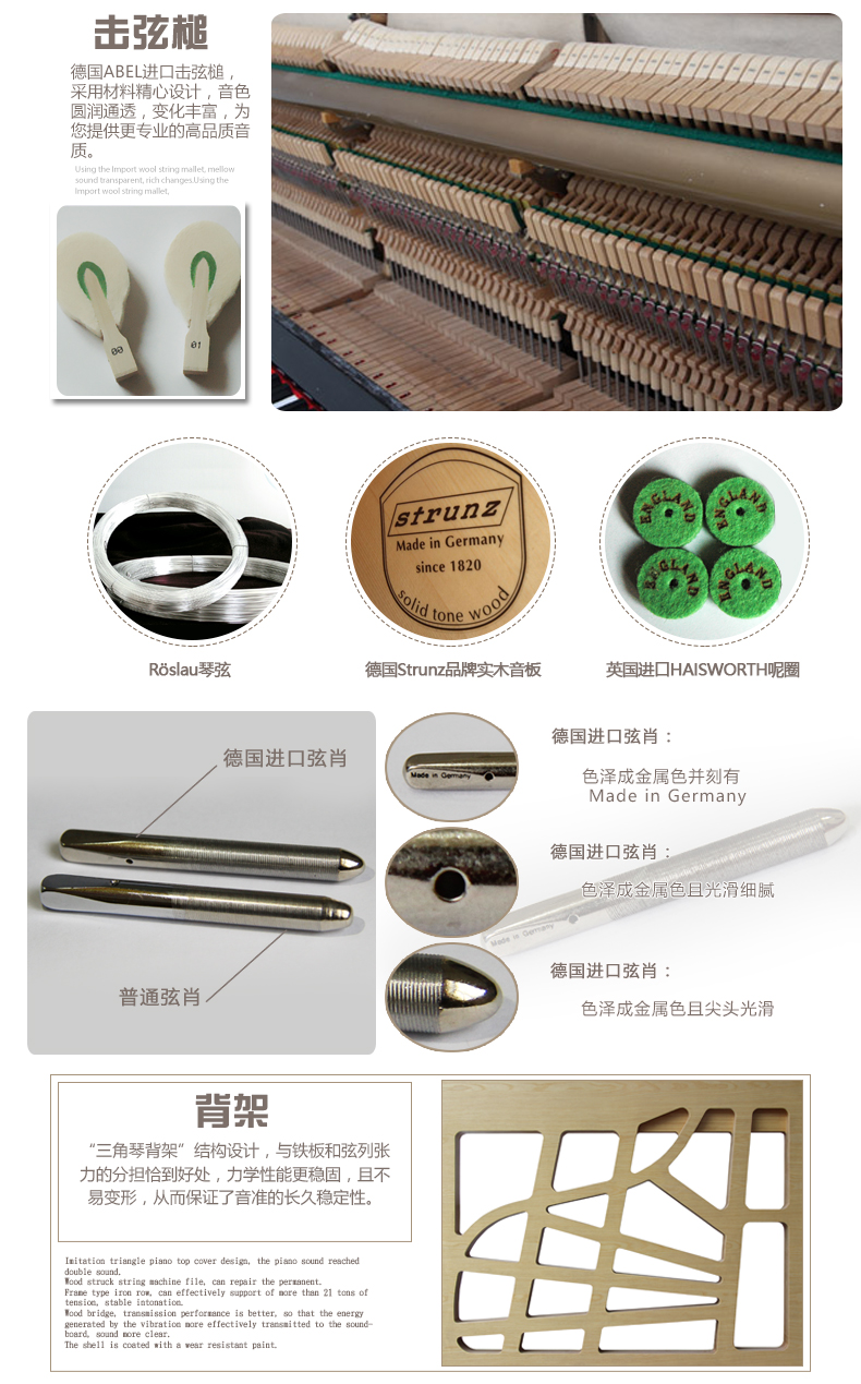 琴弦:德國Röslau品牌琴弦,直徑均勻,含碳量低、純度高、張力強(qiáng),琴弦張力可達(dá)到30噸,彈性和韌性具佳,為您提供優(yōu)美、純凈的音色。