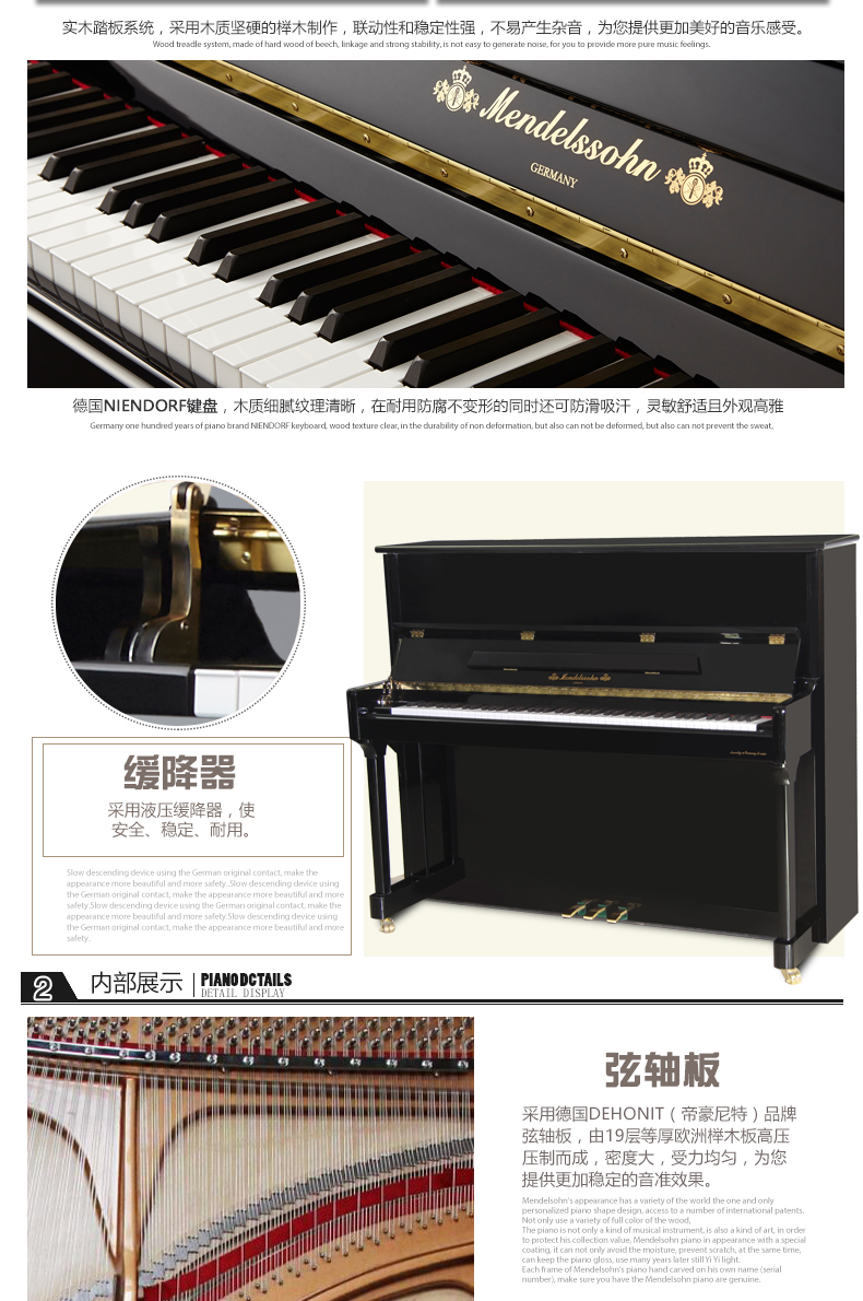 擊弦機(jī): 德國鋼琴品牌NIENDORF特選擊弦機(jī),擊弦效果更靈敏、有力,攀帶作用更穩(wěn)固,保證擊弦槌的快速連擊速度。